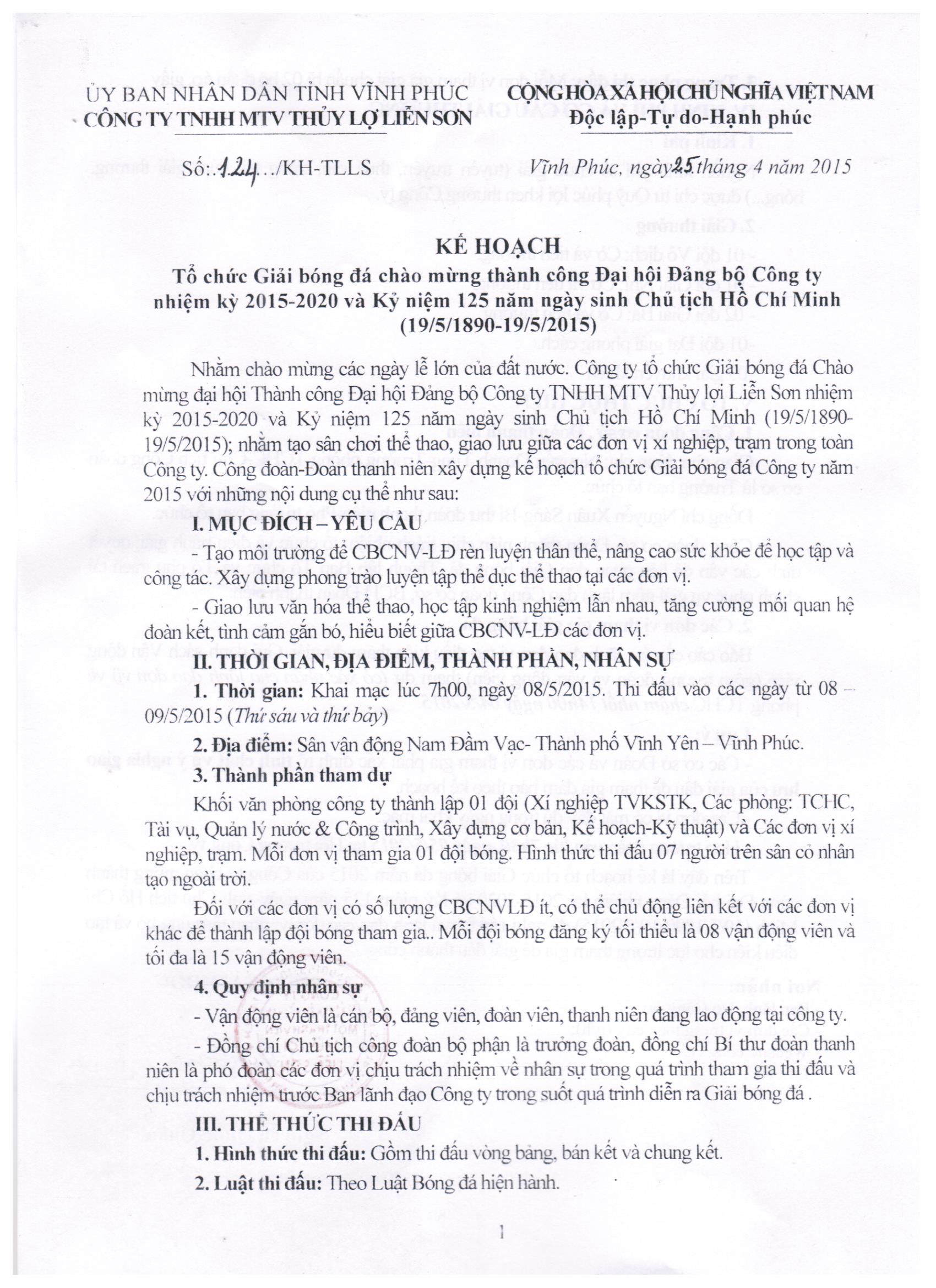 Căn cứ kế hoạch số 86/KH-ĐUK ngày 20/10/2014 của Ban chấp hành Đảng bộ khối doanh nghiệp tỉnh Vĩnh Phúc về việc Đại hội Đảng bộ các cấp nhiệm kỳ 2015-2020;Được sự đồng ý của BTV Đảng ủy khối Doanh nghiệp tỉnh Vĩnh Phúc. Đảng bộ công ty TNHH MTV Thủy lợi Liễn Sơn tổ chức Đại hội Đảng bộ nhiệm kỳ 2015-2020.