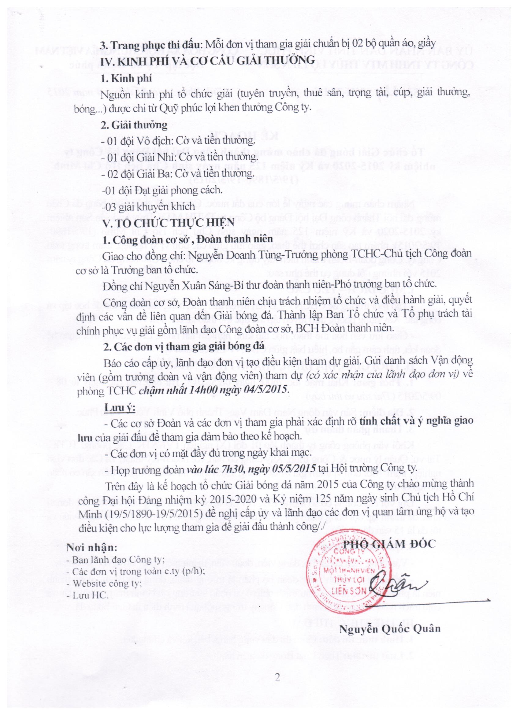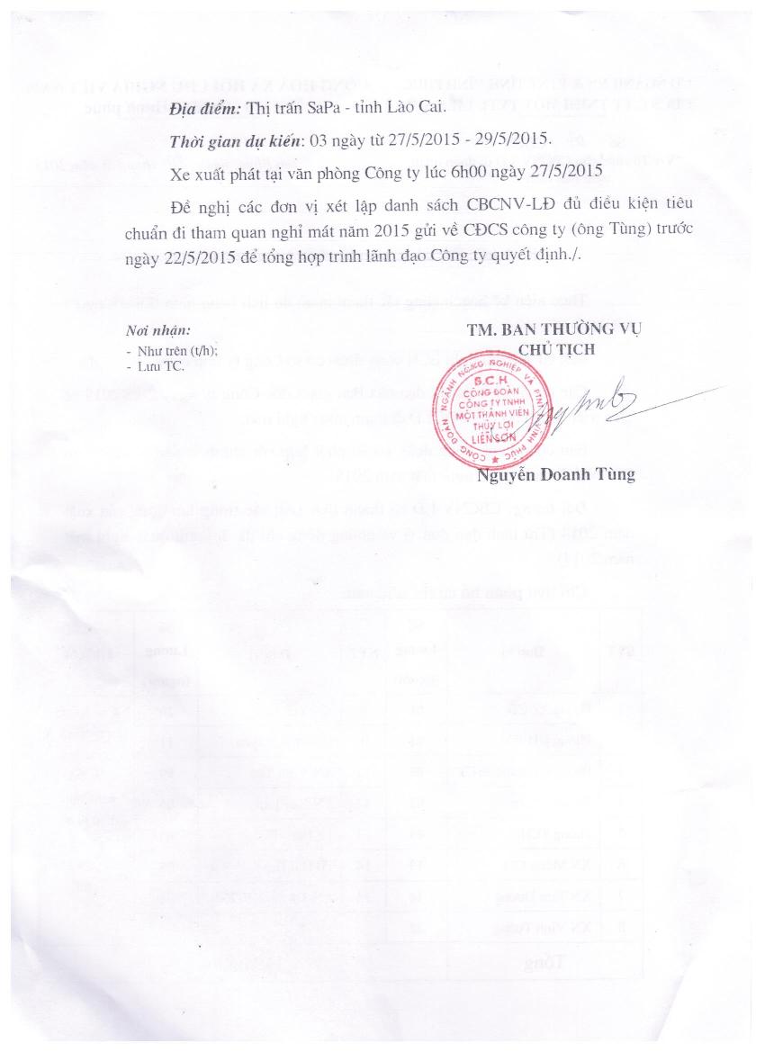 Công ty TNHH một thành viên thuỷ lợi Liễn thông báo đến các đơn vị trong toàn Công ty thực hiện nghỉ ngày lễ Giỗ Tổ Hùng Vương, ngày lễ Chiến thắng 30/4 và ngày Quốc tế lao động 1/5 năm 2015 như sau: