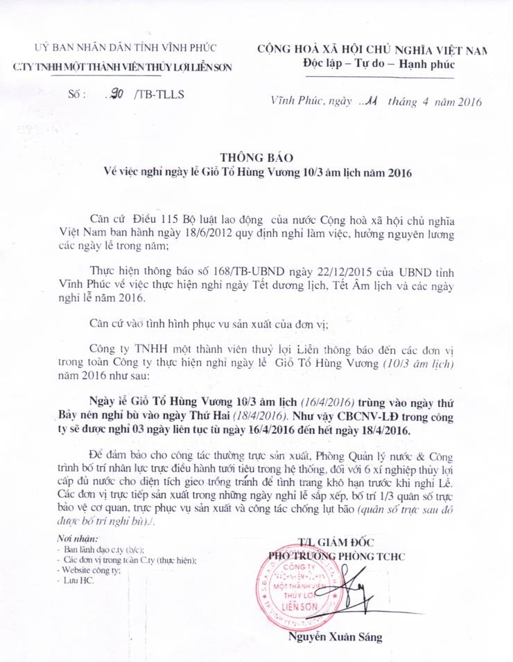 Thông báo nghỉ ngày Giỗ Tổ Hùng Vương 10/3 ân lịch năm 2016