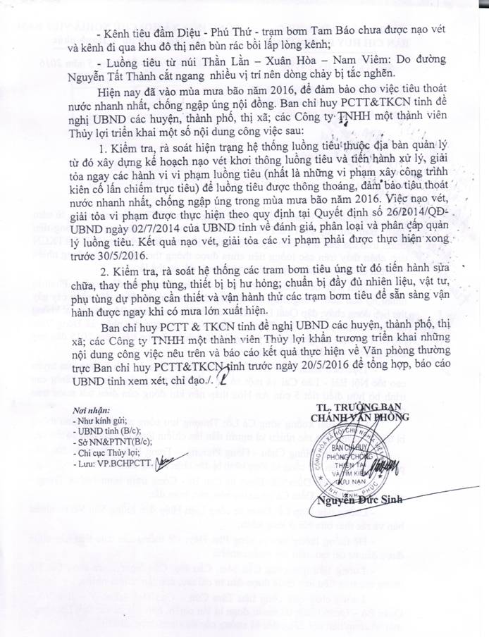 Khơi thông các nguồn tiêu và sử lý các vi phạm vào hành lang bảo vệ các luồng tiêu phục vụ PCTT năm 2016
