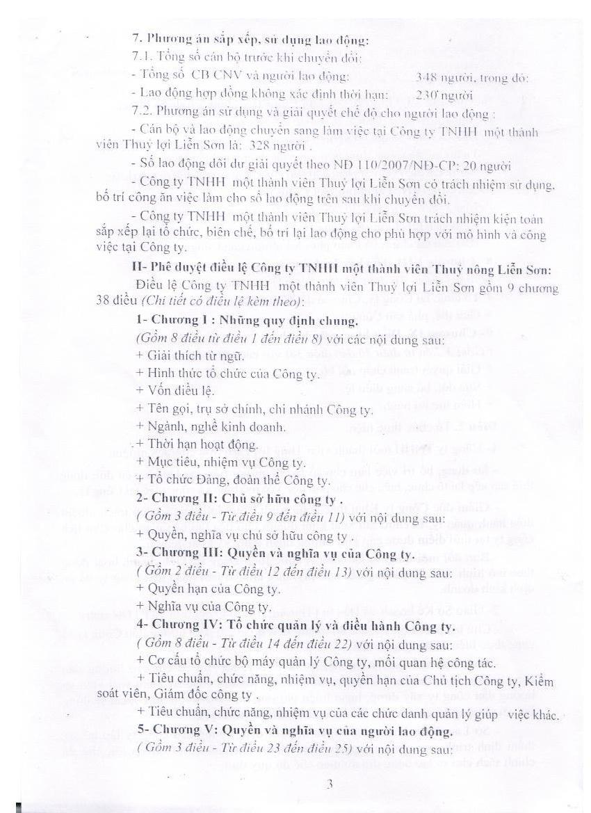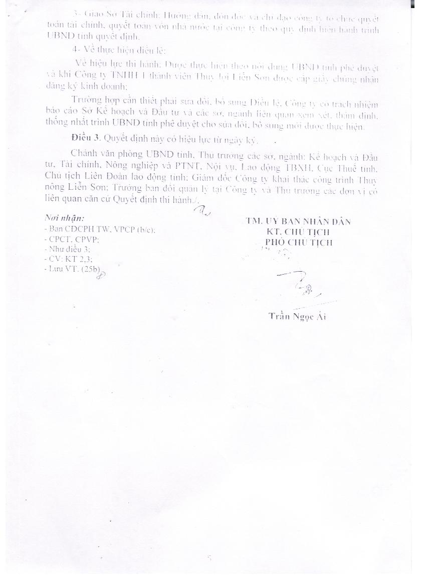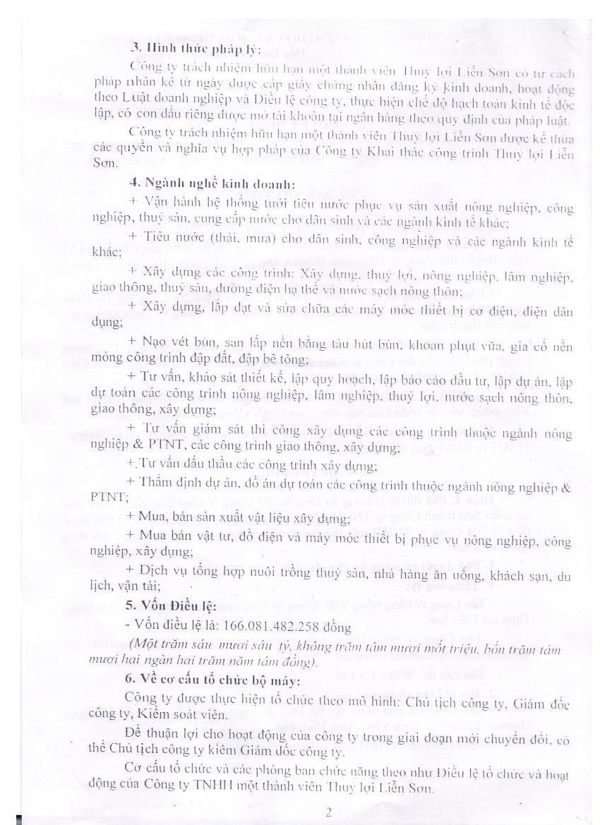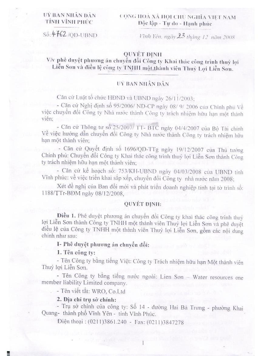 Quyết định phê duyệt phương án chuyển đổi Công ty Khai thác công trình thủy lợi Liễn Sơn và điều lệ Công ty TNHH MTV Thủy lợi Liễn Sơn