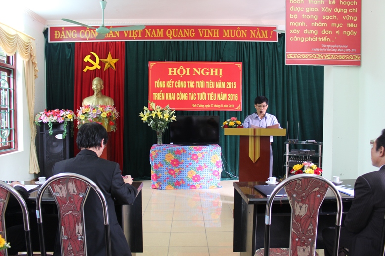 Đồng chí Lê Hồng Minh - Giám đốc Xí nghiệp thủy lợi Vĩnh Tường thông qua báo cáo tổng kết năm 2015