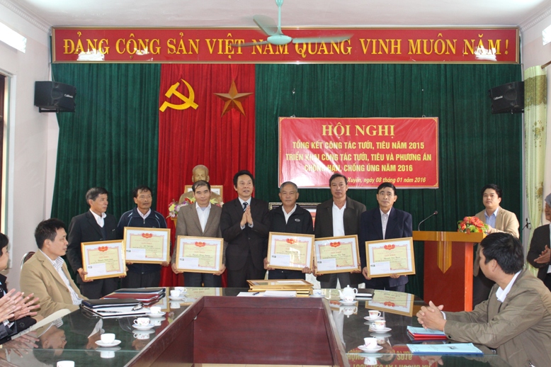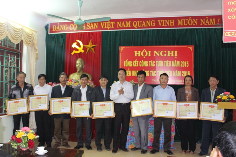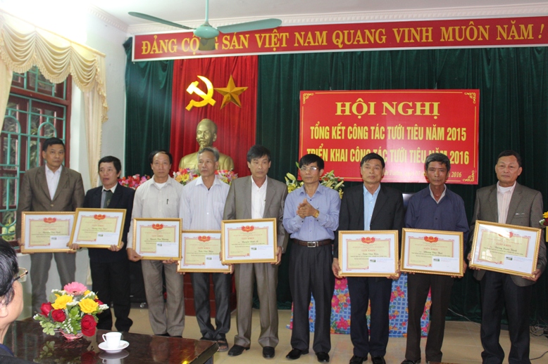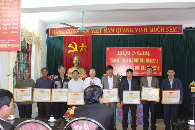 Đồng chí Nguyễn Gia Quyền trao giấy khen và phần thưởng cho các Trạm thủy lợi