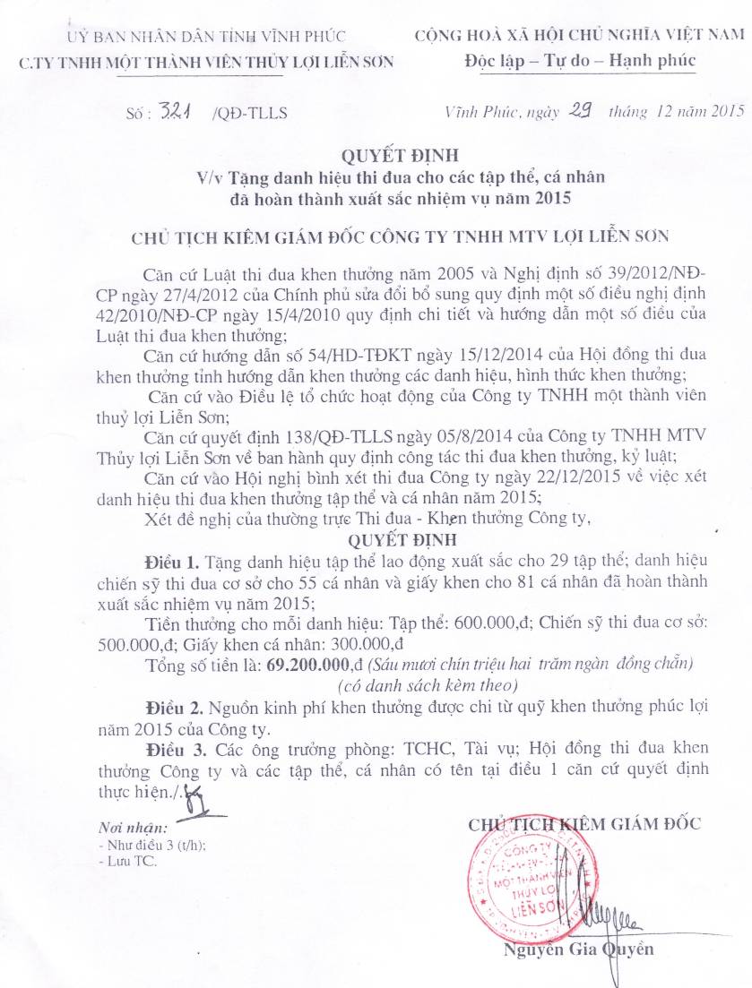 Quyết định tặng danh hiệu thi đua cho các tập thể, cá nhân đã hoàn thành xuất sắc nhiệm vụ năm 2015