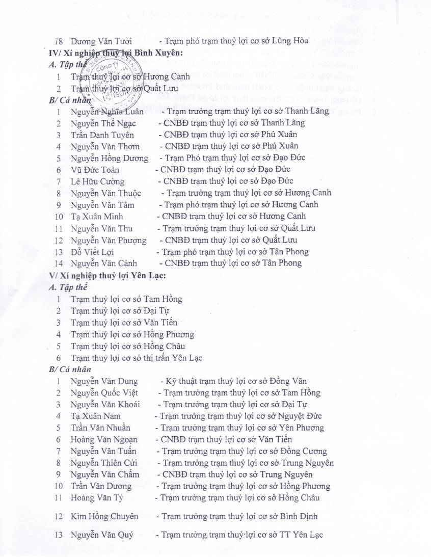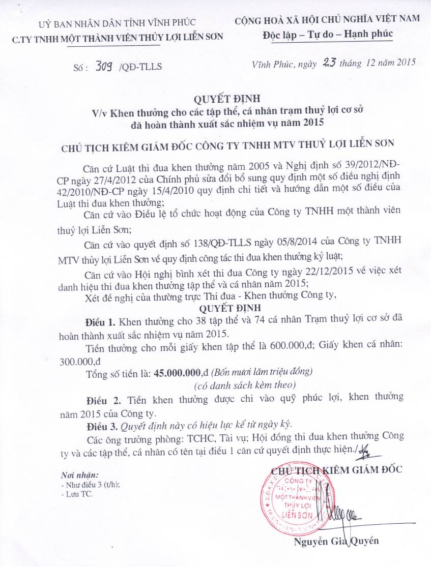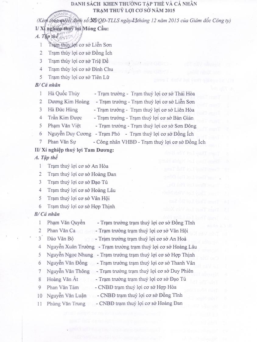Quyết định khen thưởng cho các tập thể, cá nhân trạm thủy lợi cơ sở đã hoàn thành xuất sắc nhiệm vụ năm 2015