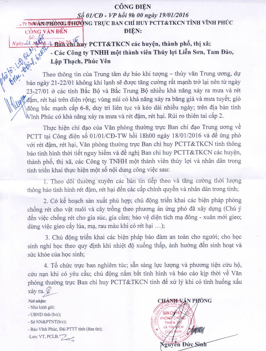 Công điện số: 01/CĐ-VP của Ban chỉ huy PCTT&TKCN tỉnh Vĩnh Phúc ngày 19/01/2016, Thông báo tình hình thời tiết nguy hiểm.
