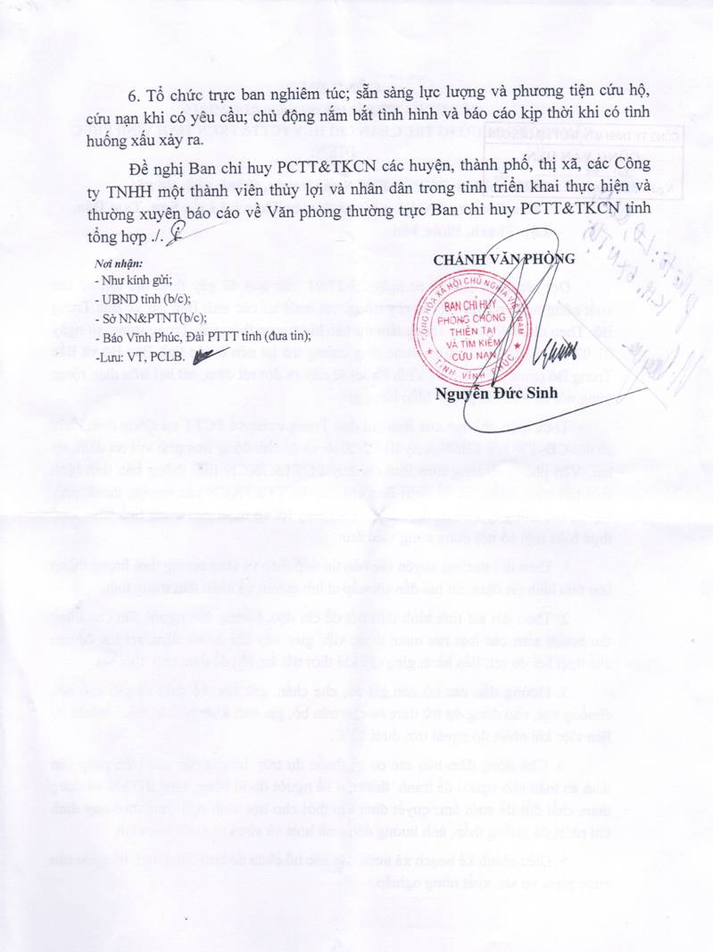 Công điện số 02/CĐ-VP của văn phòng thường trực Ban chỉ huy PCTT&TKCN tỉnh Vĩnh Phúc hồi 19h ngày 01/02/2016